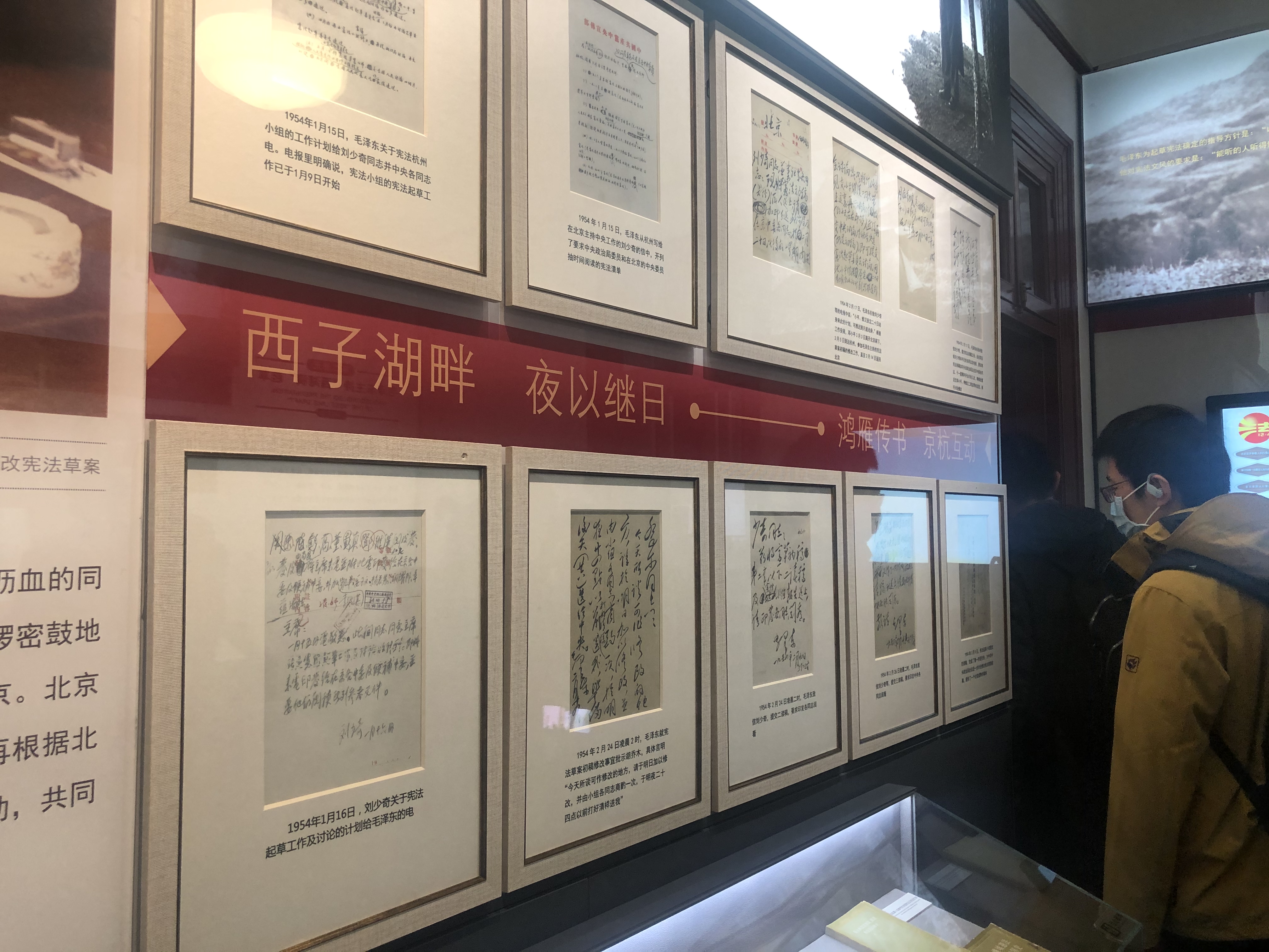 随后党员们依次参观了陈列馆的复原陈列厅及其余五个单元内容,复原陈列厅主要向我们展示了毛主席在杭州起草宪法期间的工作,生活,学习的场景。其余五个单元内容从“五四宪法”的起草,讨论,通过到实施的全过程让我们充分了解宪法,陈列馆从制定五四宪法的历史背景,让我们了解到一部宪法的从无到有的坎坷;再从毛泽东同志与宪法起草小组在杭州度过的77个日夜让我们明白一部宪法从初稿到反复修改完善的不易;这一部宪法汇聚了各界人士的意见,在1954年6月14号公布后,全国各界1.5亿余人参加了宪法草案的学习讨论,规模之宏大,人民之重视。终于1954年9月20日,中华人民共和国第一届全国人民代表大会第一次会议,以全票同意的结果通过了新中国第一部宪法。五四宪法的通过与实施,推进了人民民主政权建设的发展完善,开启了社会主义民主与法制建设的新纪元。
