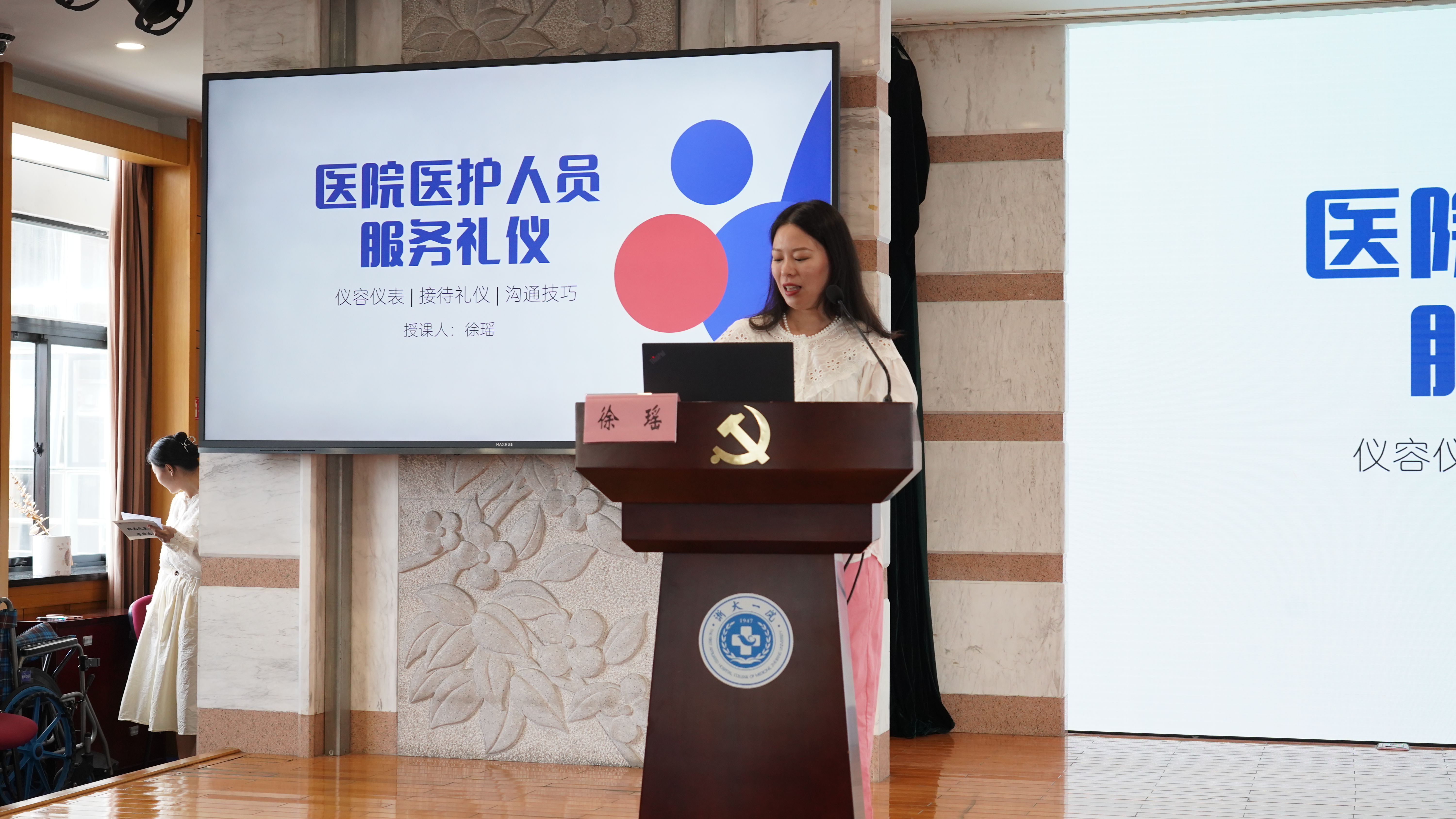 在授课环节,原杭州师范大学钱江学院空乘/播音专业教师、原浙江人民广播电台主持人、省级普通话水平测试员、鼎源书画院主理人徐瑶老师为大家作《医务人员服务礼仪与沟通》主题培训。此次培训采用“理论+实践”相结合的方式,从形象礼仪、举止姿态、沟通技巧等方面作了系统讲述,并通过现场演示详细指导实施的关键要点,旨在由外及内提升窗口工作人员专业形象、沟通能力,进一步提升窗口服务质量和患者满意度。台上老师娓娓道来,台下医务人员频频点头,互动满满,收获多多。